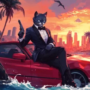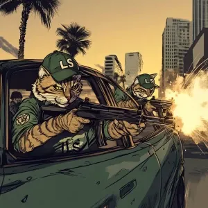 «Two humanoid cats engaged in a dramatic shootout, depicted in an...»