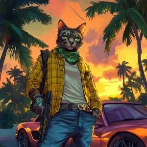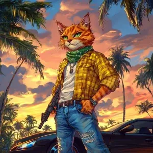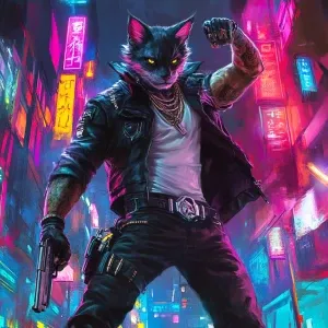 «A humanoid cat character, with a rugged appearance, positioned i...»