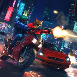 «Create an image of a humanoid cat character on a motorcycle in a...»