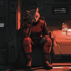 «A humanoid cat character, sitting in a relaxed posture with one...»