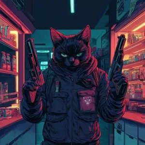 «A masked street cat holding two pistols during a tense convenien...»