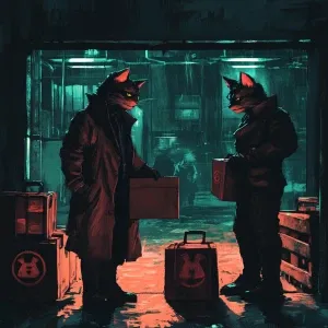 «A shady cat in a trench coat exchanging a briefcase with another...»