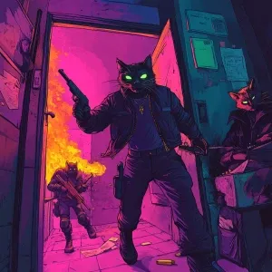 «Anthropomorphic gangster cats in hoodies and ski masks robbing a...»
