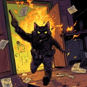 «A crime boss cat flipping a table as SWAT-like cats burst throug...»