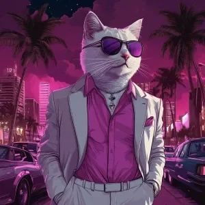 «A pastel-colored Shiba cat in a Miami Vice outfit – white suit,...»