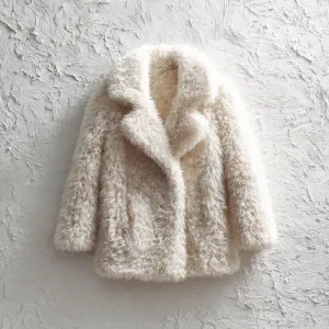 «Create a Fluffy white faux fur coat with oversized lapels, soft...»