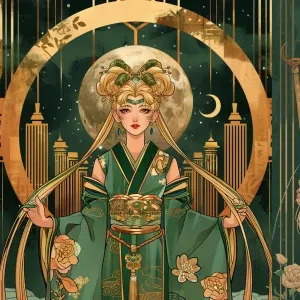 «Elegant, cinematic portrait of a Sailor Moon–Geisha heroine in a...»