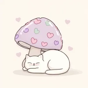«cute chubby white cat sleeping under a pastel pink mushroom with...»
