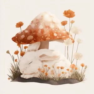 «Sleeping fluffy rabbit under spotted mushroom, small wildflowers...»