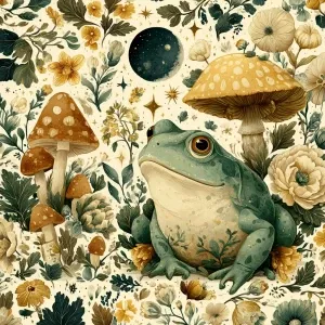 «Whimsical illustrated frog, mushrooms, moon phases, mystical for...»