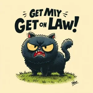«A grumpy cartoon-style cat standing on a lawn, fur fluffed up, o...»