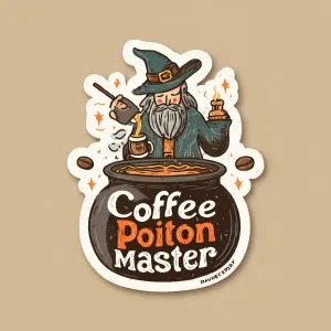 «Create a sticker for hand-drawn wizard brewing coffee, fun bold...»