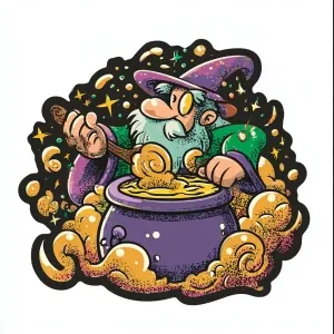 «sticker design, hand-drawn wizard brewing coffee in a cauldron,...»
