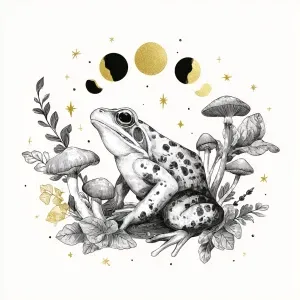 «Whimsical illustrated frog, mushrooms, moon phases, mystical for...»