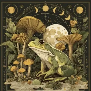 «Whimsical illustrated frog, mushrooms, moon phases, mystical for...»