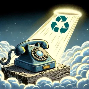 «An old phone needs help to be recycled. In recicle heaven.»