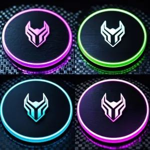 «Four futuristic coasters on black carbon surface, glowing neon e...»