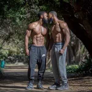«two black men, bodybuilders, six pack in stomach, black hair, b...»