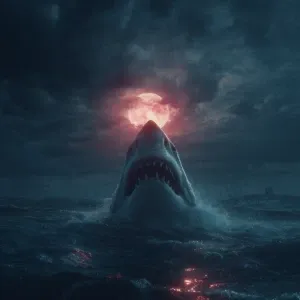 «"A monstrous great white shark erupting from crimson-tinged ocea...»