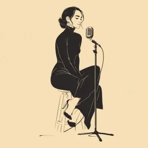 «An beautiful womanis seated before a microphone»