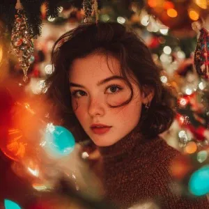 «woman sitting near Christmas tree looking into the camera in Chr...»