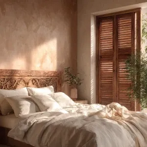 «Generate an image of an Italian bedroom featuring white linen be...»