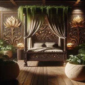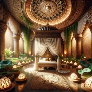 «In the Papyrus Dream Chamber, envision a canopy bed of rich, int...»