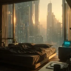 «A luxurious futuristic apartment bedroom at dawn. Soft golden li...»