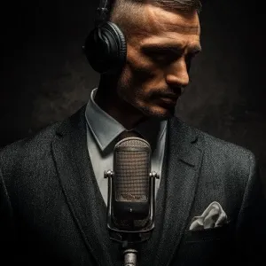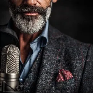«Generate a photo of a sophisticated, man Include a microphone i...»
