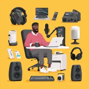 «Generate a realistic image showing a man recording a VoiceOver u...»