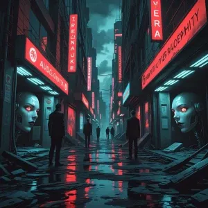 «In the heart of a bustling cyberpunk metropolis, a terrifying ch...»
