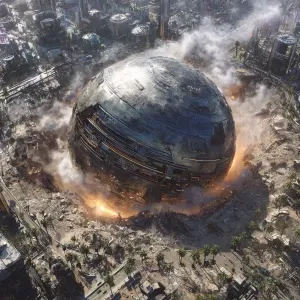 «A massive, futuristic metallic sphere descends at hypersonic spe...»