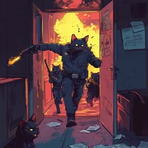 «A crime boss cat flipping a table as SWAT-like cats burst throug...»
