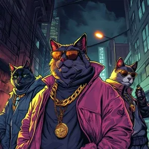 «A group of cool gangster cats in an urban environment, wearing s...»
