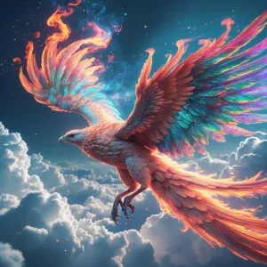 «A celestial phoenix of swirling colors and ethereal flames, radi...»