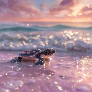 «A baby sea turtle named Tika, crawling gently across soft, wet s...»