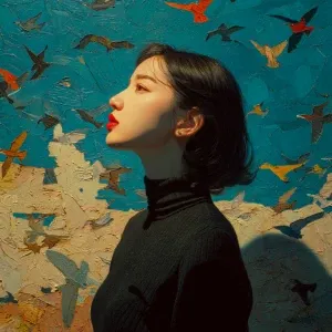 «A graceful young woman with flowing black hair, adorned in a del...»