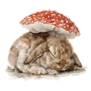 «Sleeping rabbit curled up under protective mushroom, dreamy wate...»