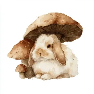 «Soft fluffy rabbit under spotted mushroom, gentle watercolor tex...»