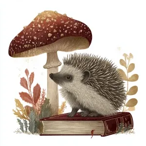 «Hedgehog resting peacefully beside mushroom, charming vintage ar...»
