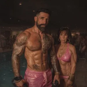 «Hyperrealistic art .a latin muscular beefy bearded tattoed sweat...»