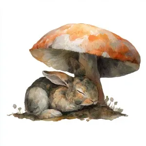 «Centered rabbit sleeping peacefully under large mushroom, waterc...»
