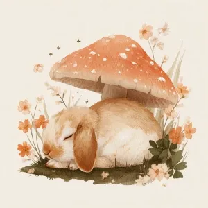 «Sleeping fluffy rabbit under spotted mushroom, small wildflowers...»