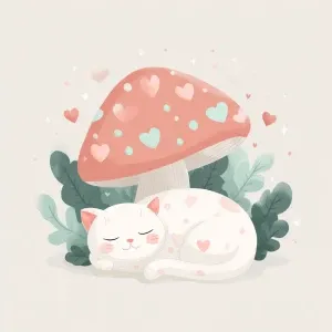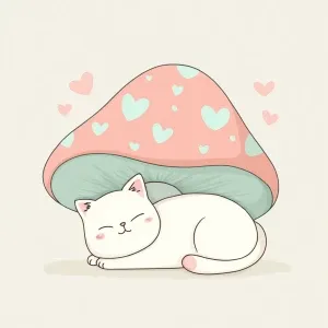 «cute chubby white cat sleeping under a pastel pink mushroom with...»