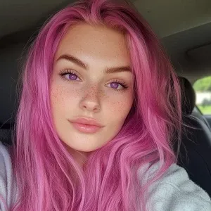 «Photo of A stunning 24yo female, pink hair and purple eyes.»