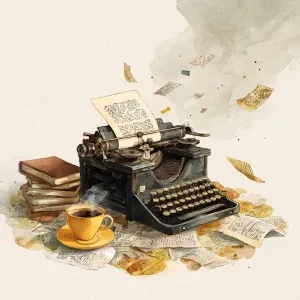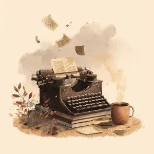 «vintage typewriter with coffee steam forming floating text, bold...»