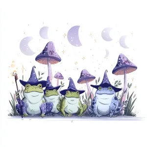 «five wise cartoon frogs in wizard hats sitting under glowing mus...»