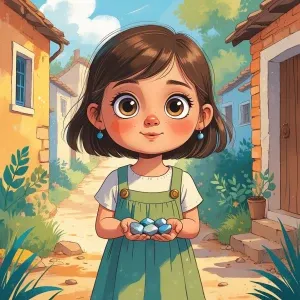 «A cute little girl with big curious eyes, wearing a simple dres...»