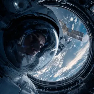 «photo of an astronaut wearing a space suit, visibly floating out...»