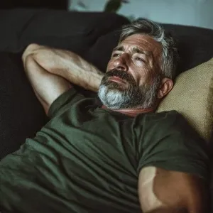 «The image shows a muscular bodybuilder man lying on a couch, app...»
